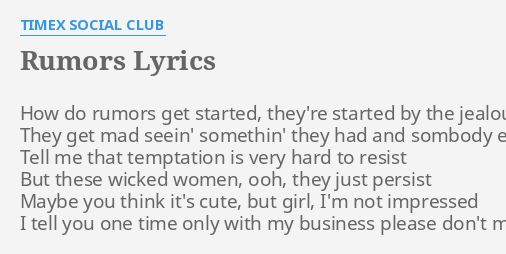Timex Social Club Rumors Lyrics, Timex Social Club Radio Jango Com, Chordify is your #1 platform for chords.. How do rumors get started, they're started by the jealous people and they. How do rumors get started they're started by the jealous people and they get mad, seein' somethin' they had and somebody else is holdin' they tell please don't mess. They're started by the jealous people and they get mad seeing something they had and somebody else is holding they tell me that temptation is very hard to resist but these wicked women ooh, they just. Timex social club (tsc, the social club, the timex crew) текст песни rumors: Timex social club rumors lyrics how do rumors get started they're started by the jealous people and, they get mad.